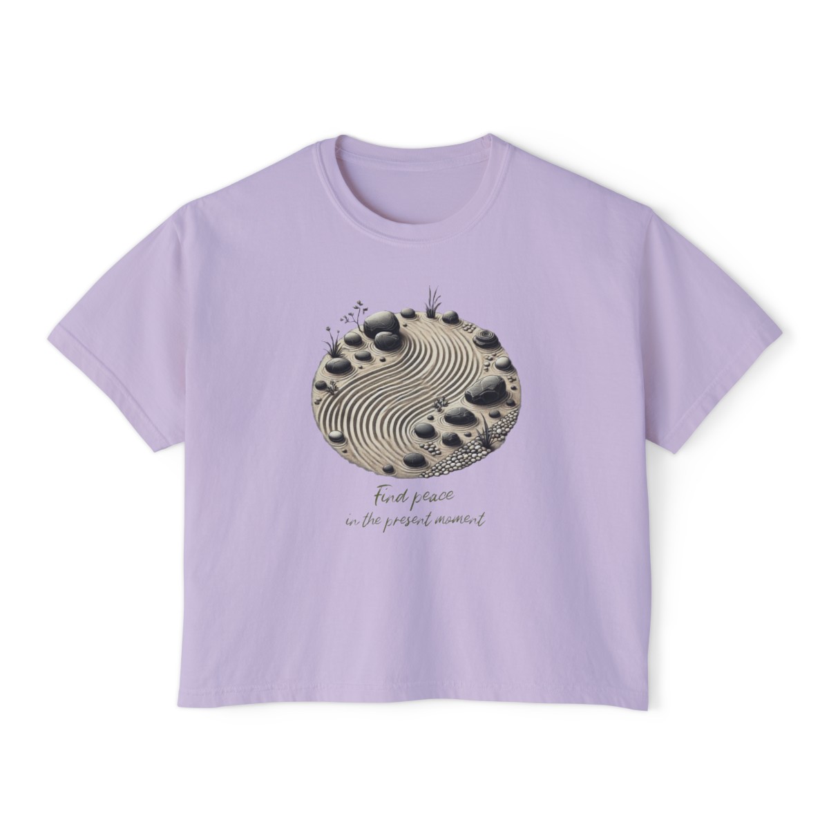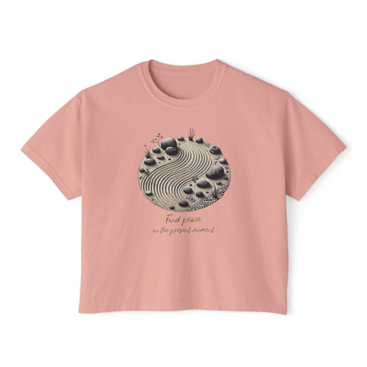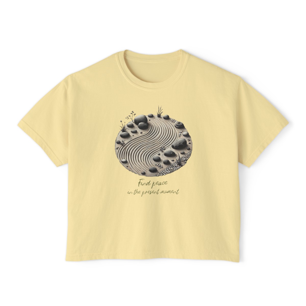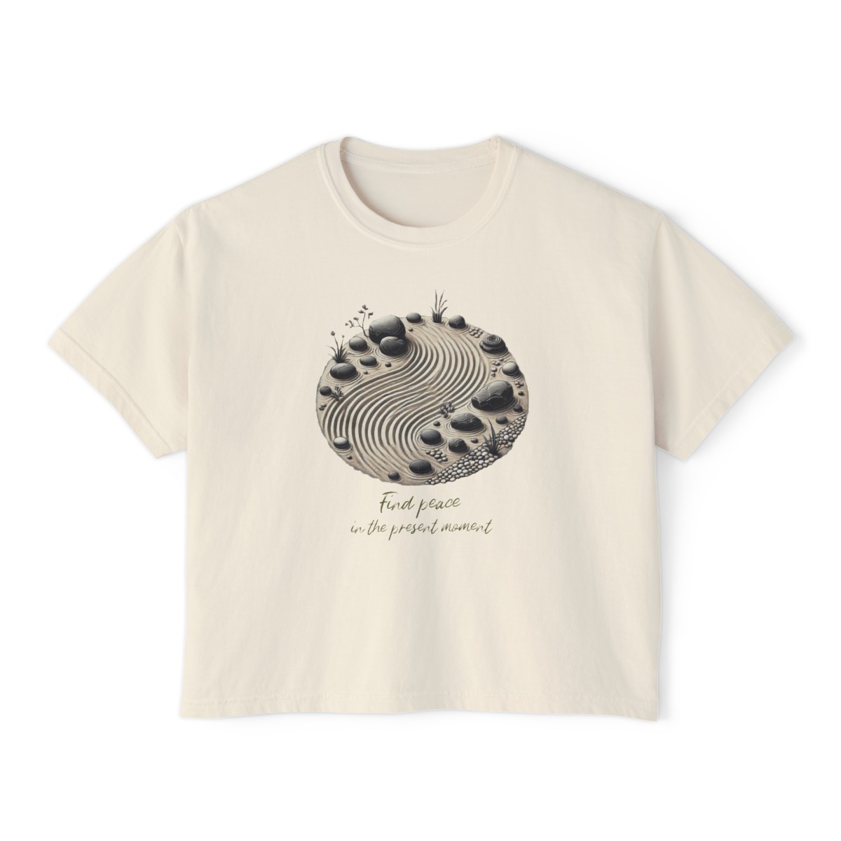 DESCRIPTION: The Mini Zen Garden Find Peace in the Present Moment Women’s Boxy Tee offers a perfect blend of comfort and style. Made from 100% ring-spun US cotton, this oversized tee provides a soft, comfortable feel. Moreover, its boxy fit and slightly cropped design add a laidback, stylish touch. Consequently, the heavy fabric ensures durability, making it ideal for any occasion. Additionally, this tee is ethically and sustainably sourced, crafted under the US Cotton Trust Protocol. Furthermore, the OEKO TEX-certified dyes bring your prints to life with eco-friendly, vibrant colors that last.