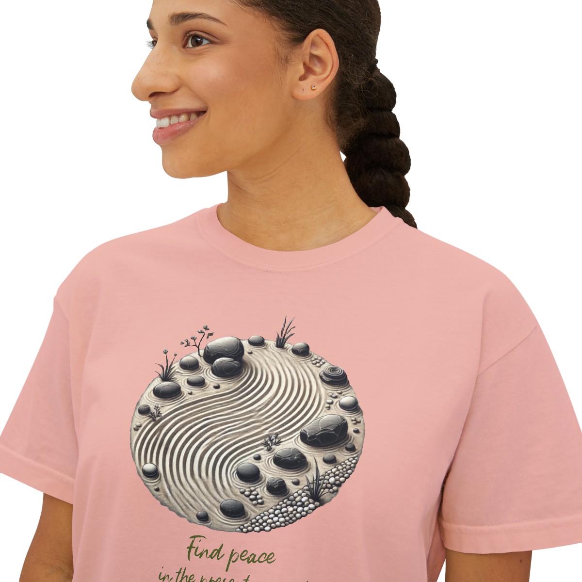 The Mini Zen Garden Women’s Boxy Tee uses 100% ring-spun US cotton, providing a soft and smooth feel.