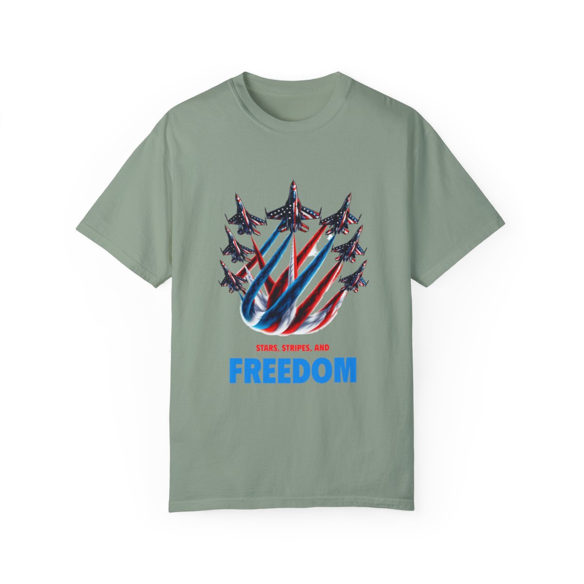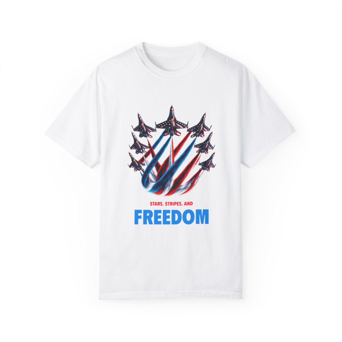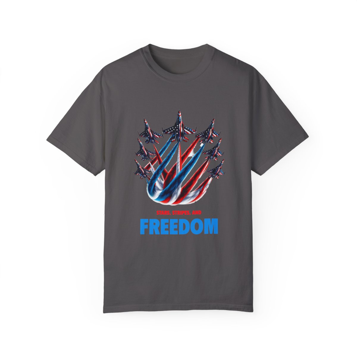 Celebrate Independence Day in style with our Patriotic Flag T-Shirt. This unisex softstyle tee features a unique design of military jets forming the stripes of the American flag, capturing the spirit of patriotism and freedom.