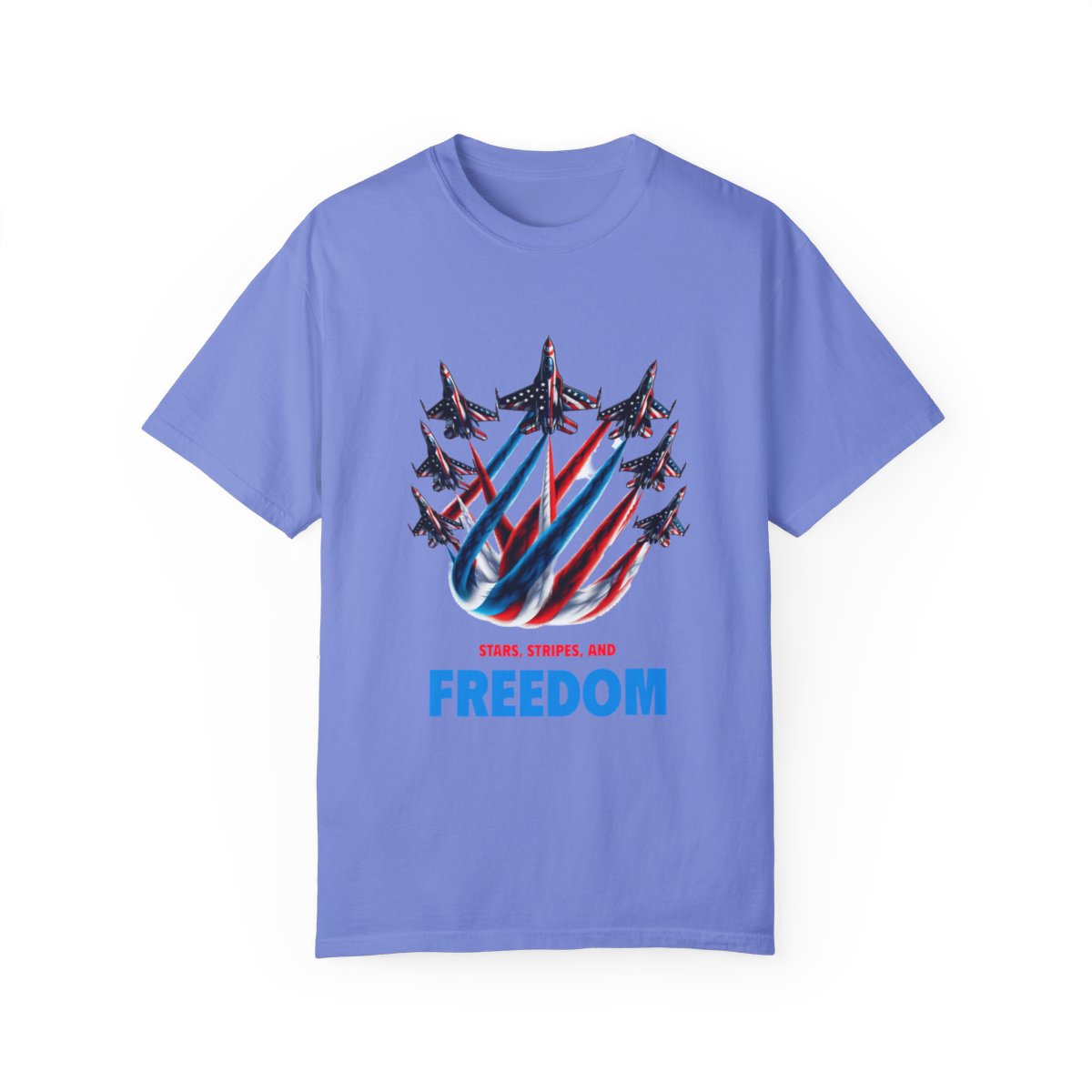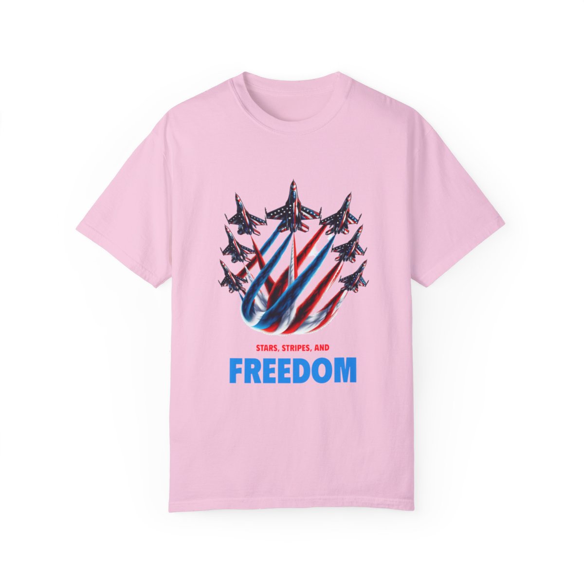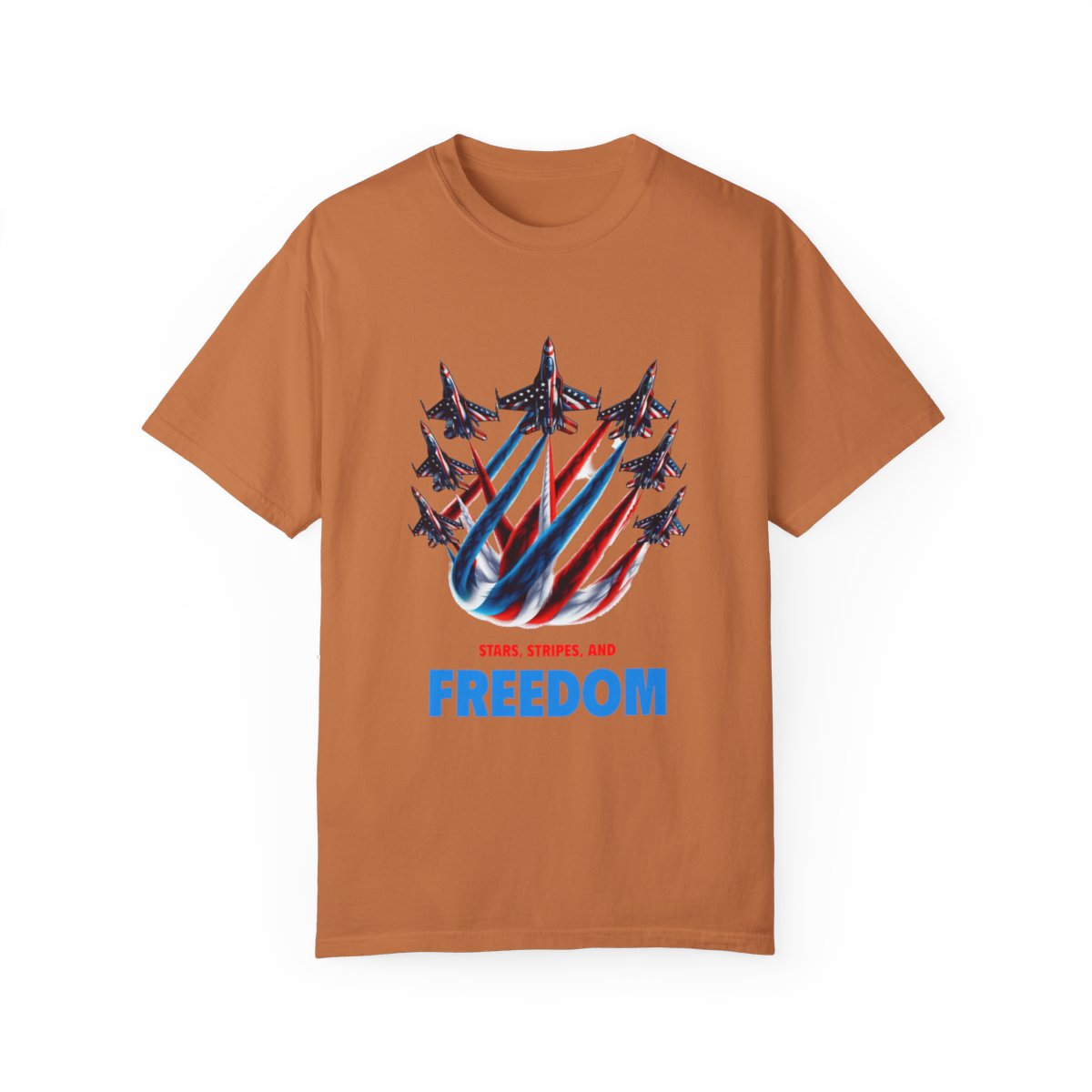 Celebrate Independence Day in style with our Patriotic Flag T-Shirt. This unisex softstyle tee features a unique design of military jets forming the stripes of the American flag, capturing the spirit of patriotism and freedom.
