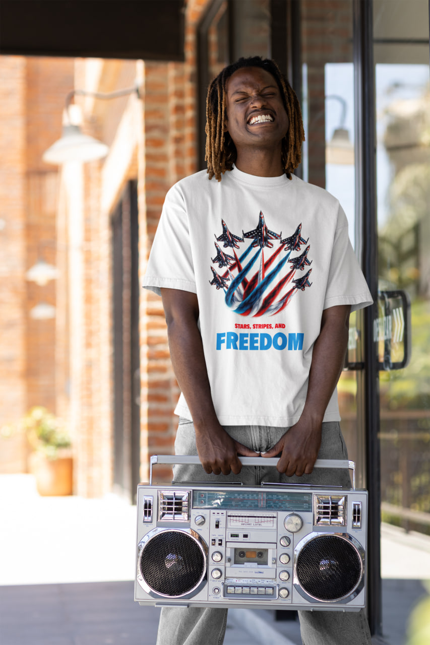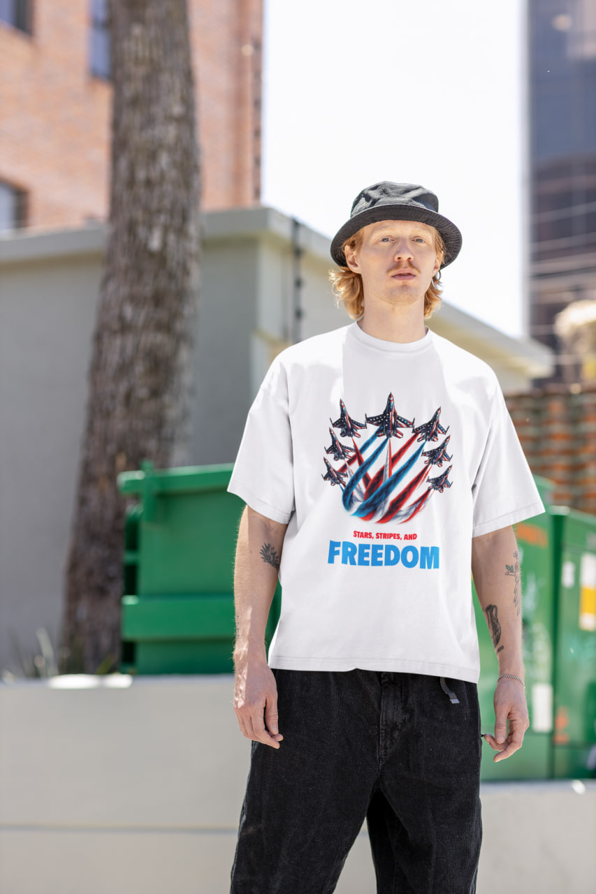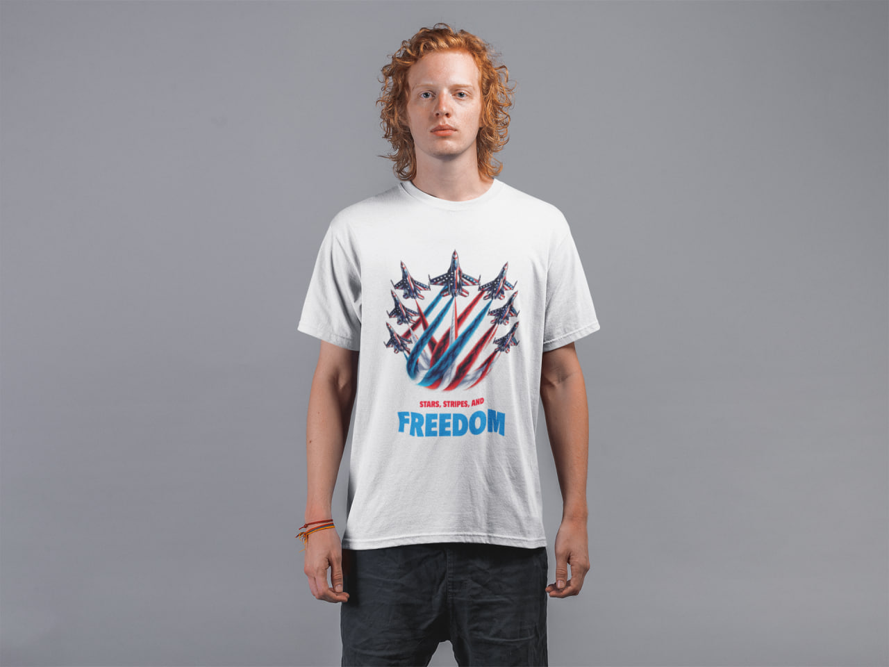 • Stylized American Flag Design: The shirt features a bold and creative design, with military jets creating the iconic stripes of the American flag.