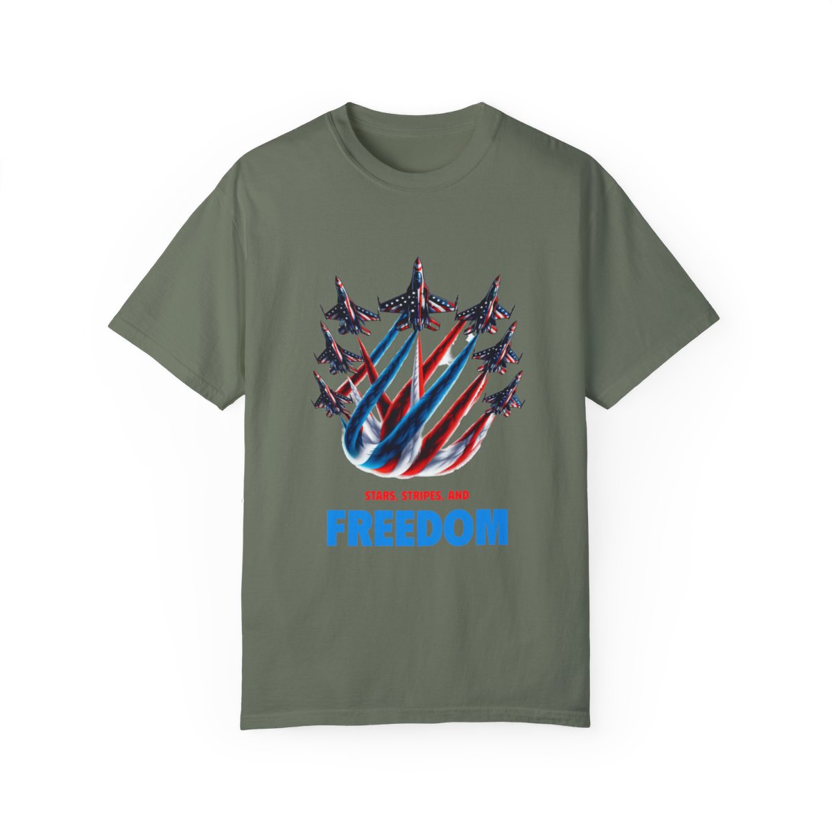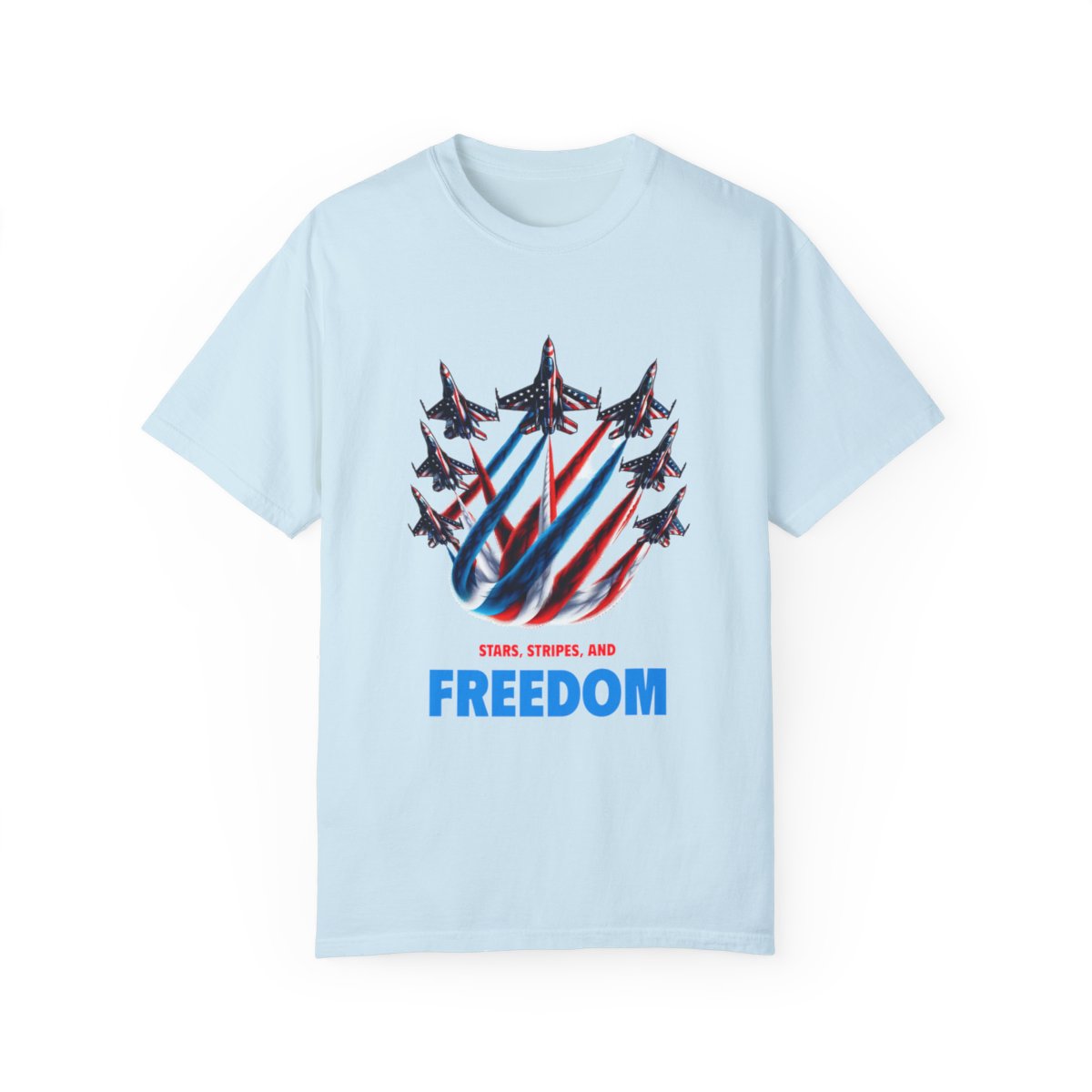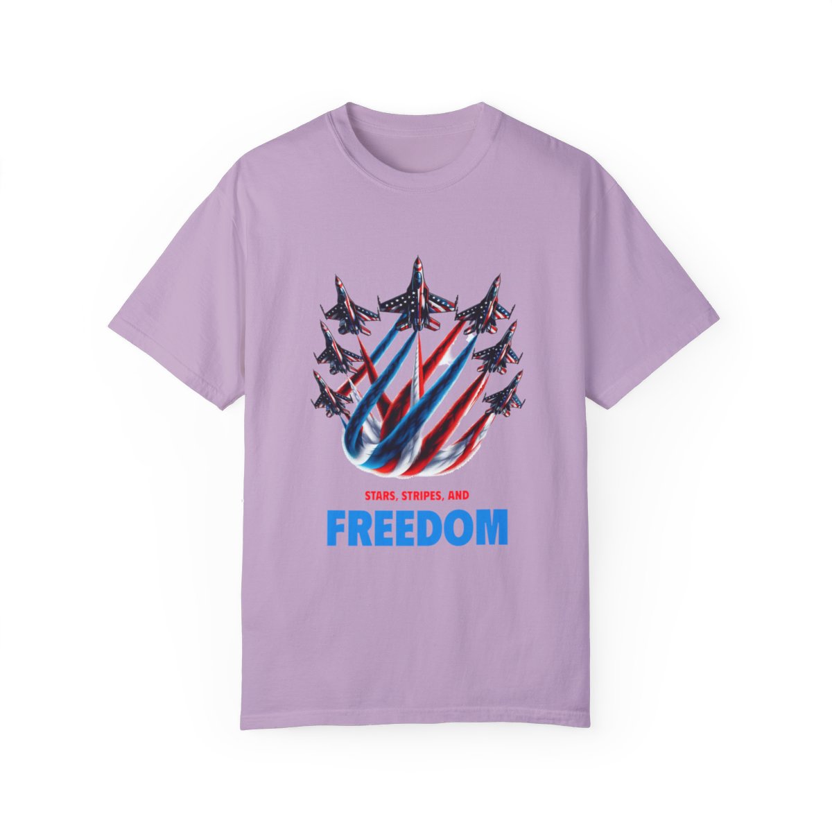 • Stylized American Flag Design: The shirt features a bold and creative design, with military jets creating the iconic stripes of the American flag.