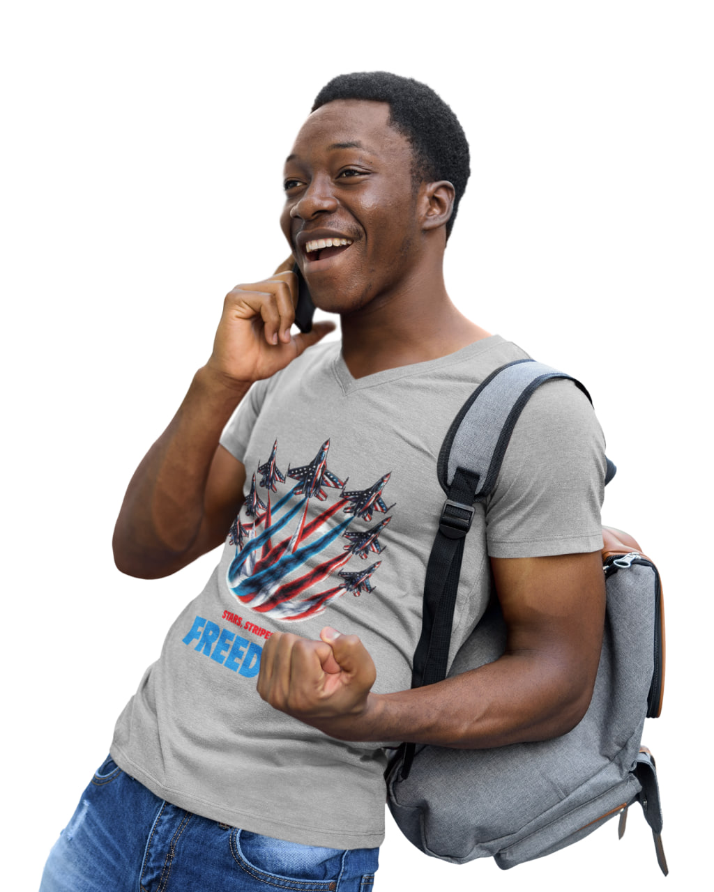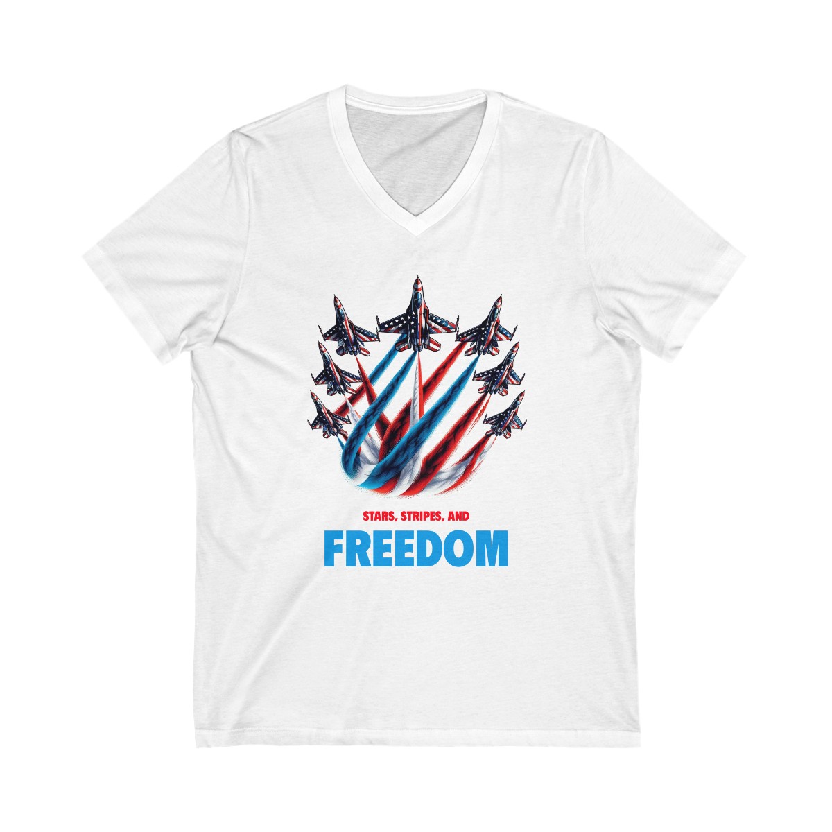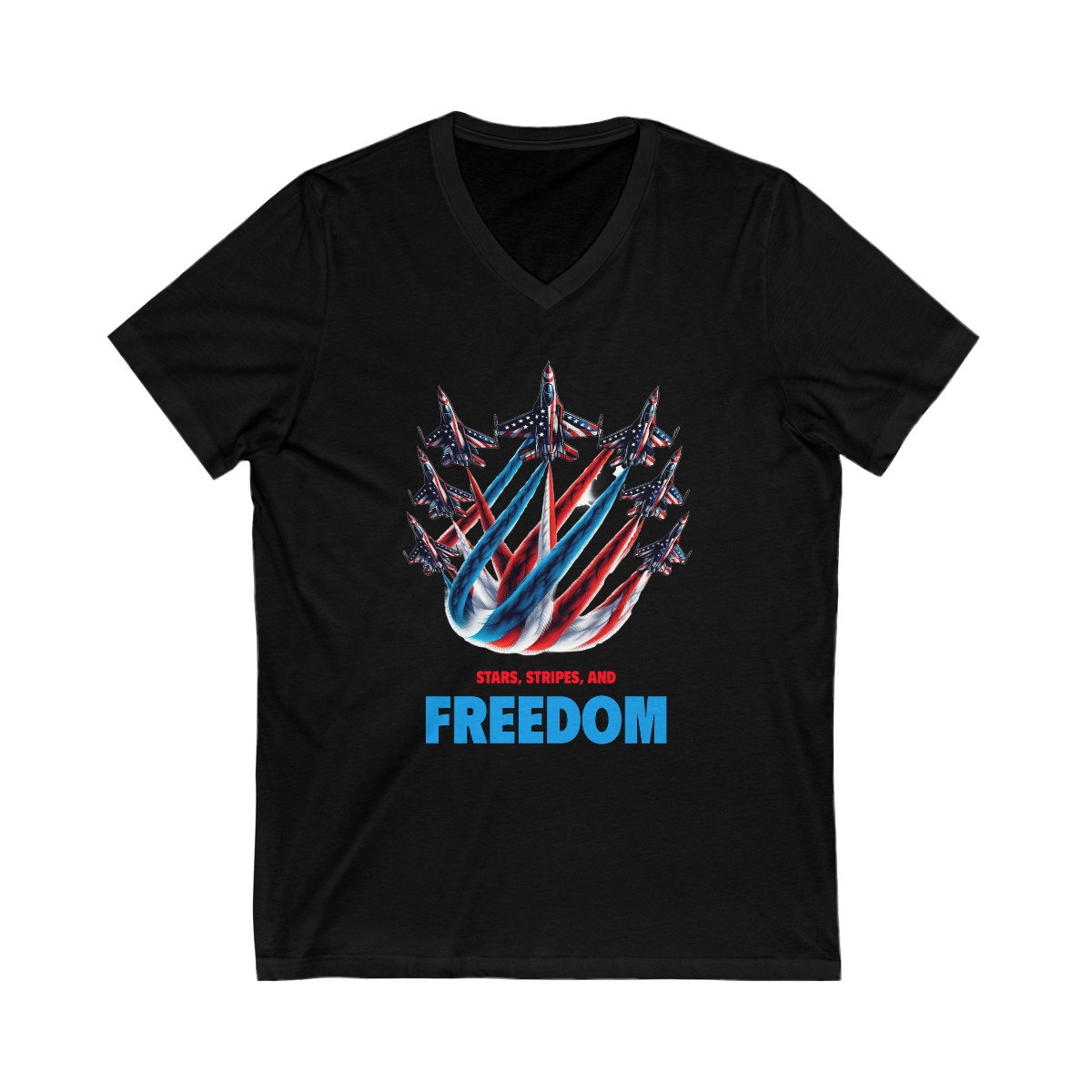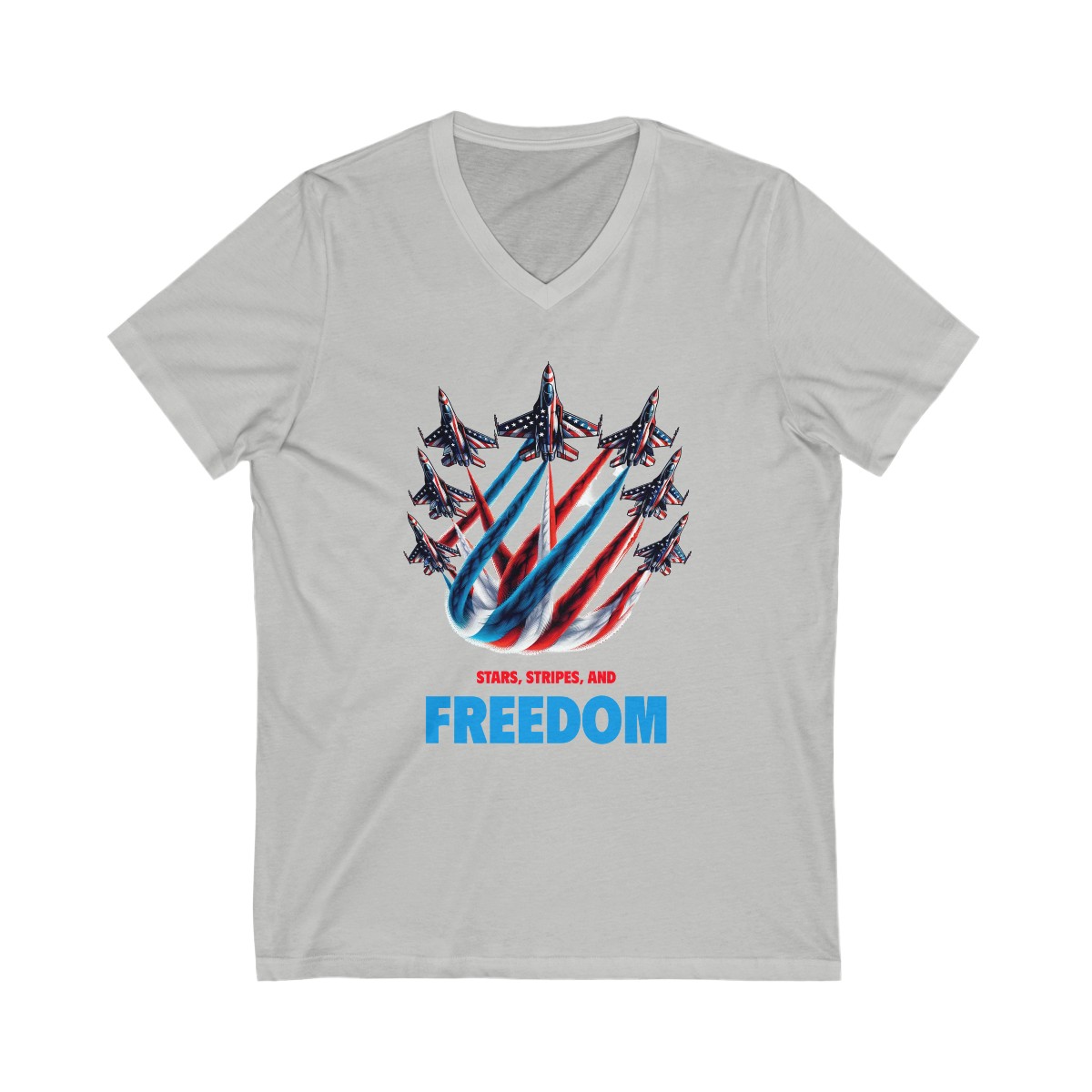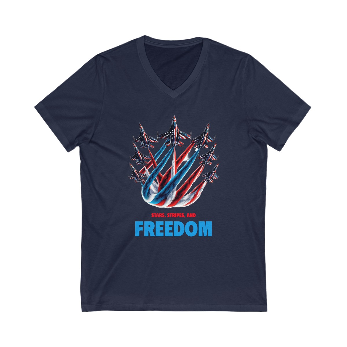 Our Patriotic V-Neck Tee is perfect for celebrating Independence Day in style. This unique 4th of July T-Shirt showcases a stylized American flag with military jets forming the stripes, capturing the spirit of patriotism and freedom.