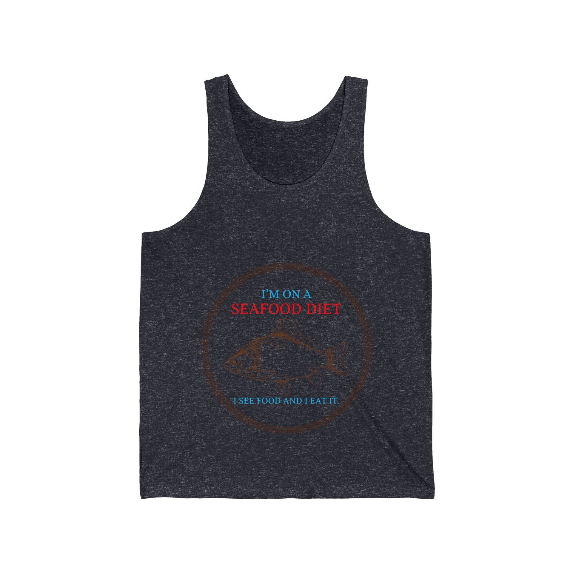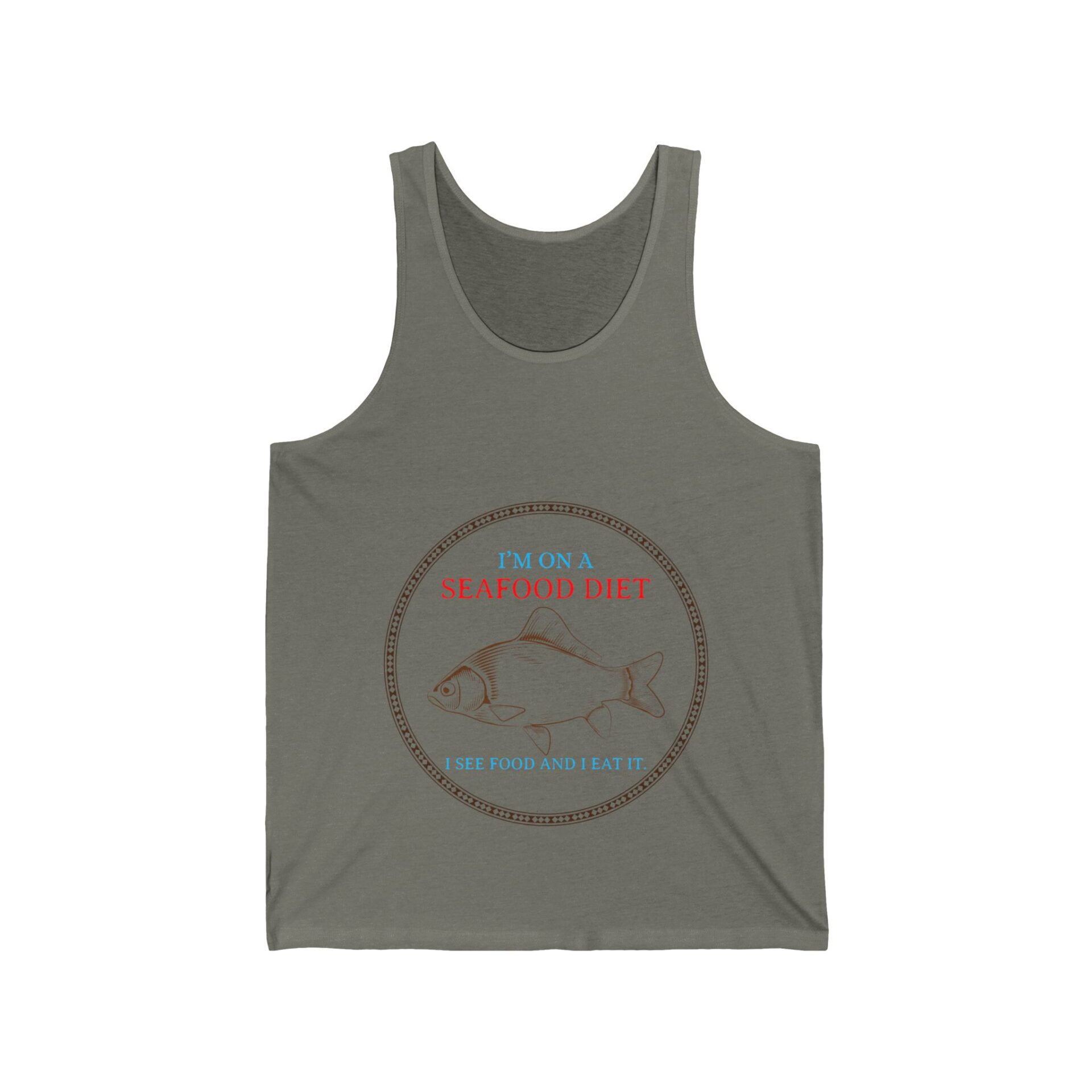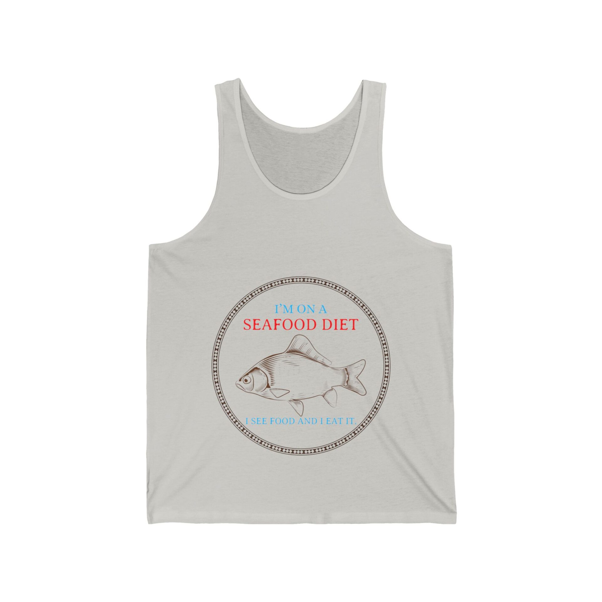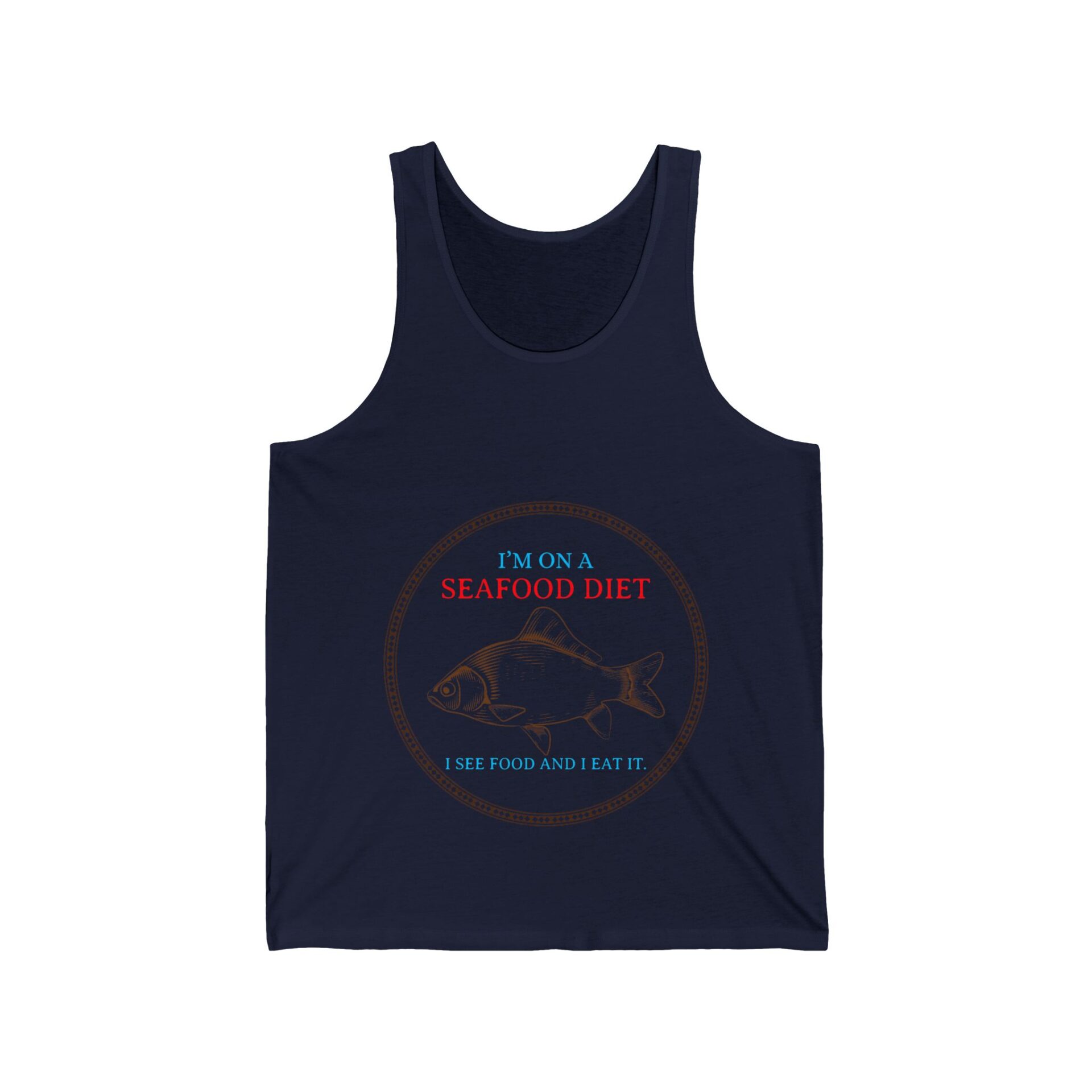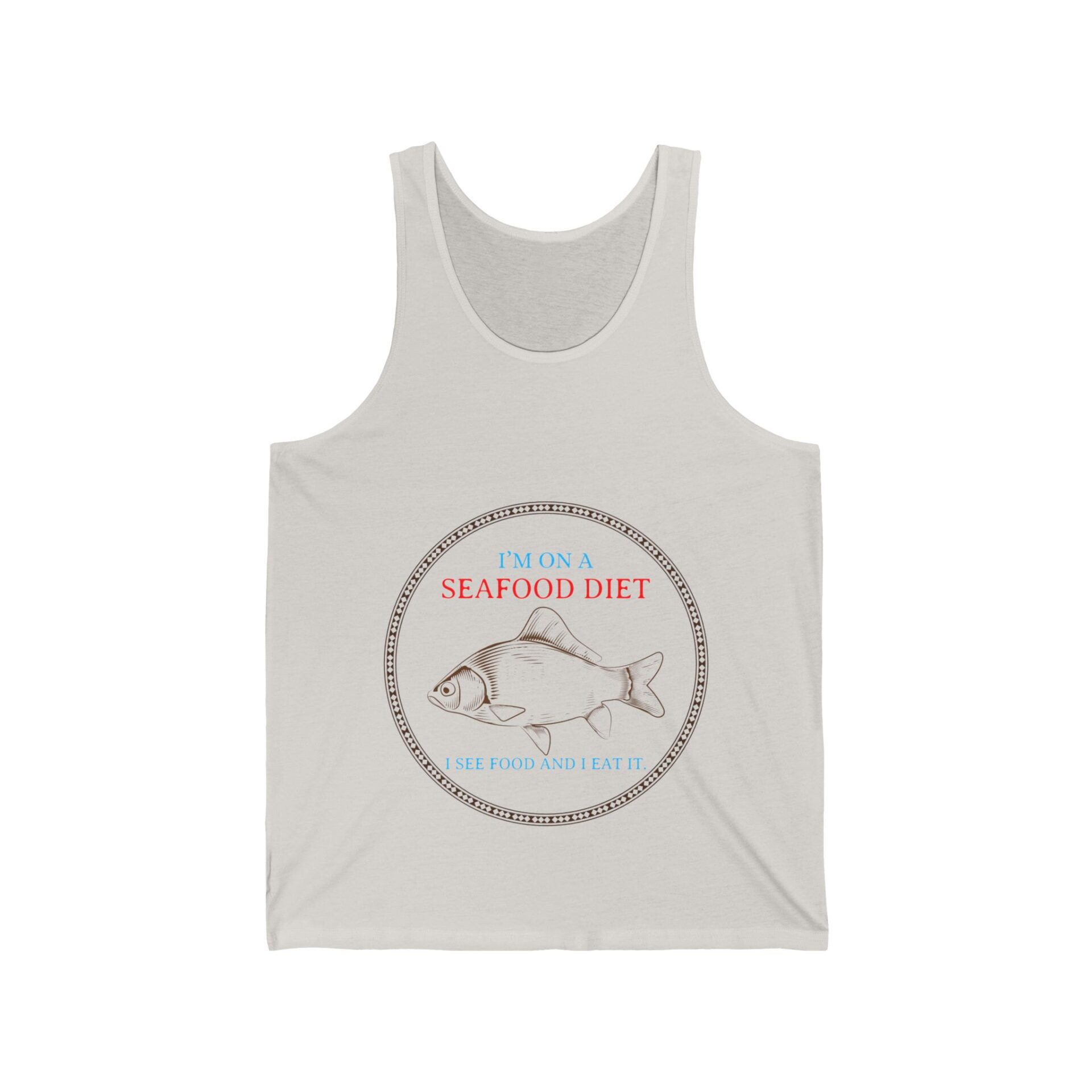 - 1 x Unisex Jersey Tank with “I’m on a Seafood Diet, When I See Food I Eat” design.