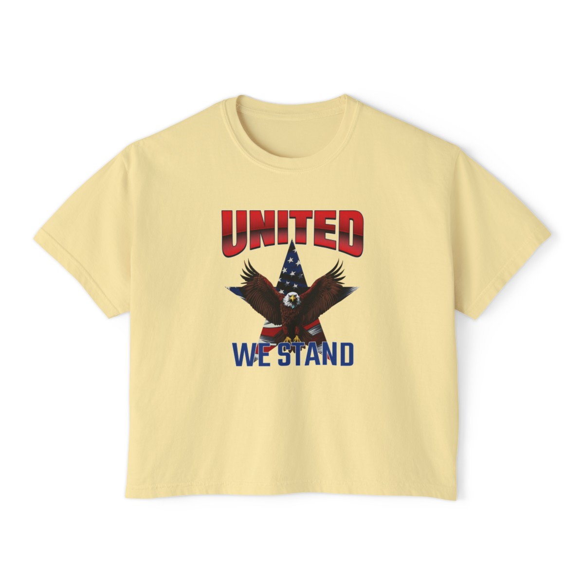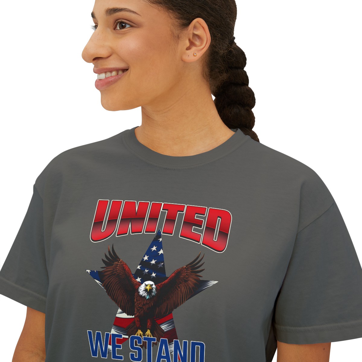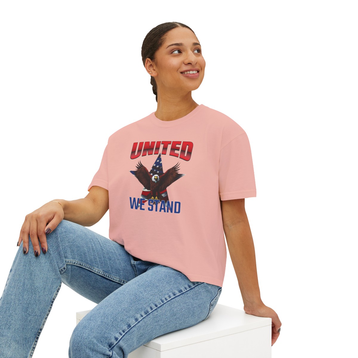 Show your USA pride with our “UNITED WE STAND” women’s boxy tee. This patriotic women’s tee is perfect for the 4th of July, Memorial Day, or any day you want to express your American spirit. Made from premium, soft fabric for comfort and durability, this tee is a must-have for your 2024 fashion collection. The bold, patriotic design is ideal for BBQs, fireworks, and casual outings, promoting a message of freedom and pride.