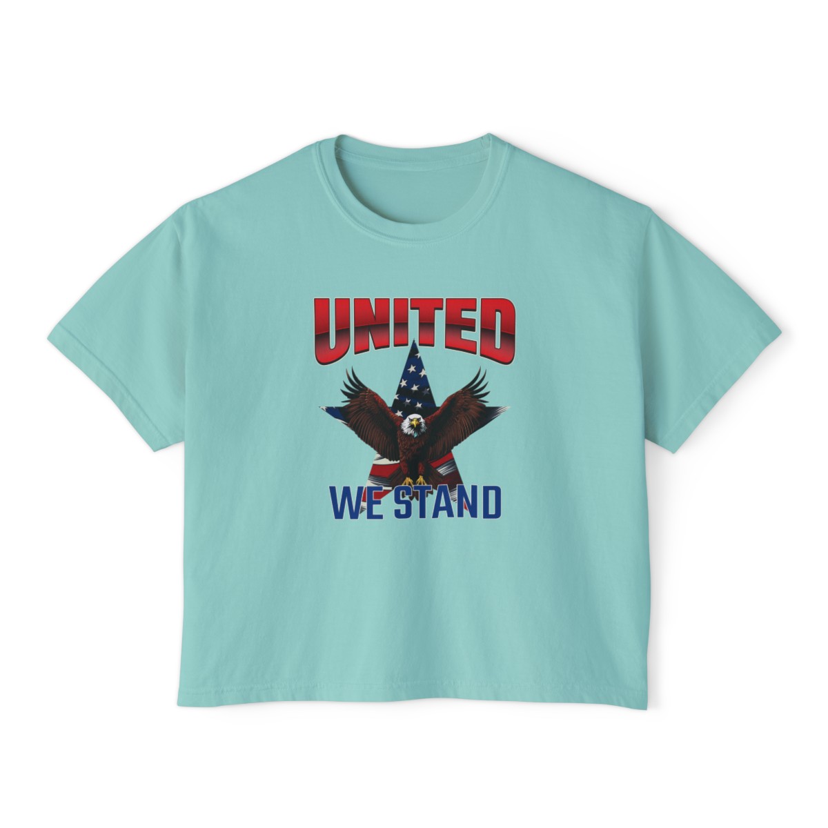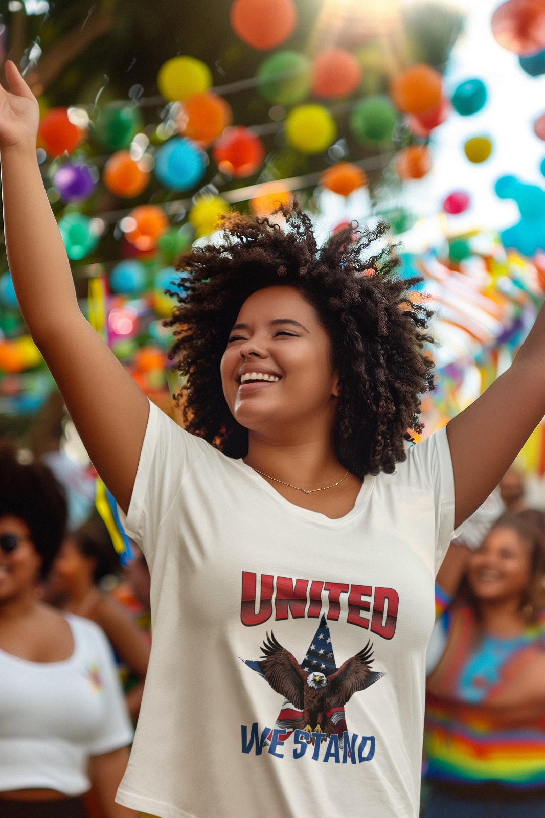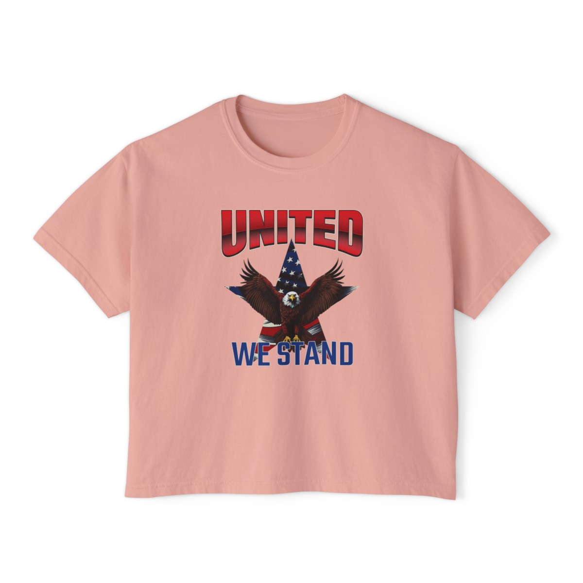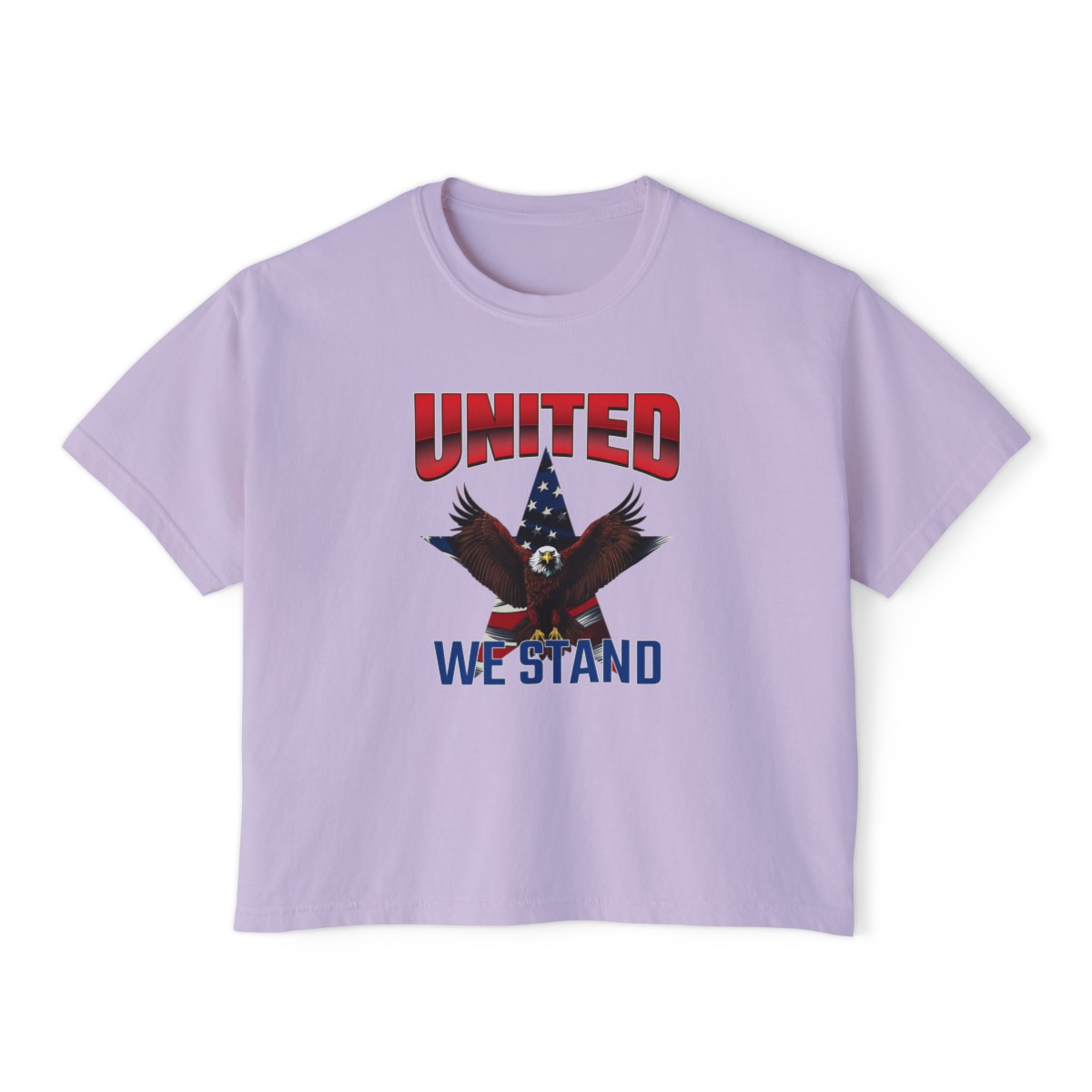 Show your USA pride with our “UNITED WE STAND” women’s boxy tee. This patriotic women’s tee is perfect for the 4th of July, Memorial Day, or any day you want to express your American spirit. Made from premium, soft fabric for comfort and durability, this tee is a must-have for your 2024 fashion collection. The bold, patriotic design is ideal for BBQs, fireworks, and casual outings, promoting a message of freedom and pride.