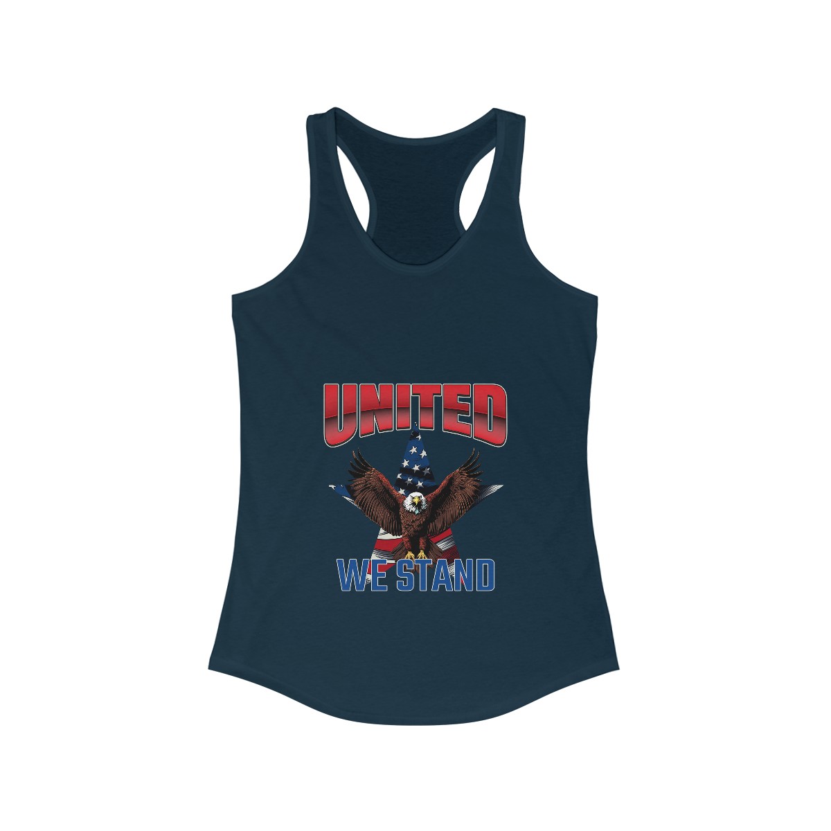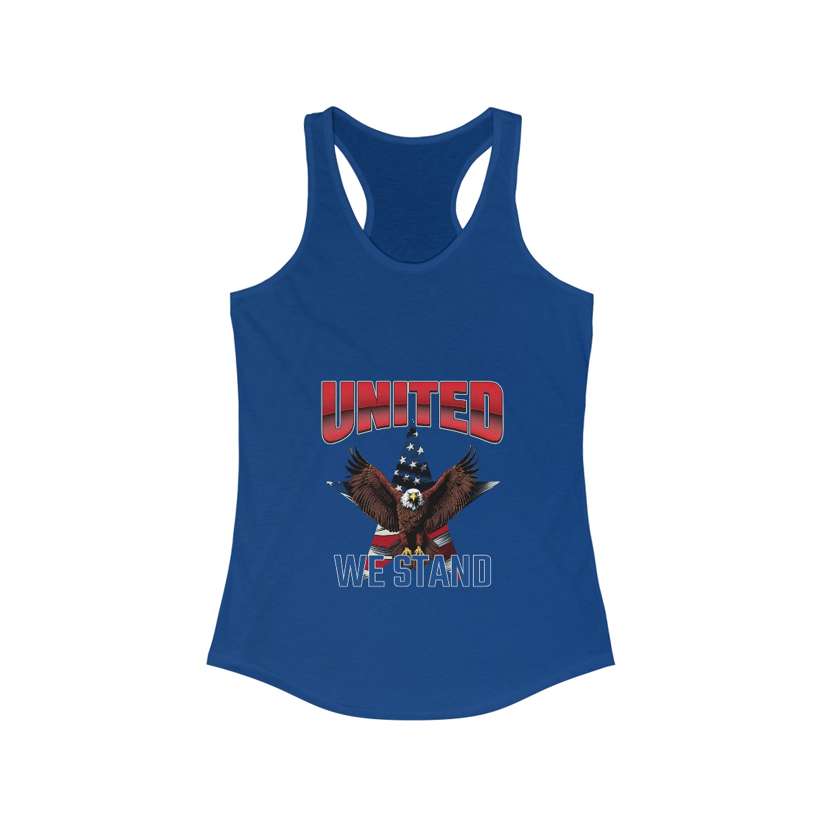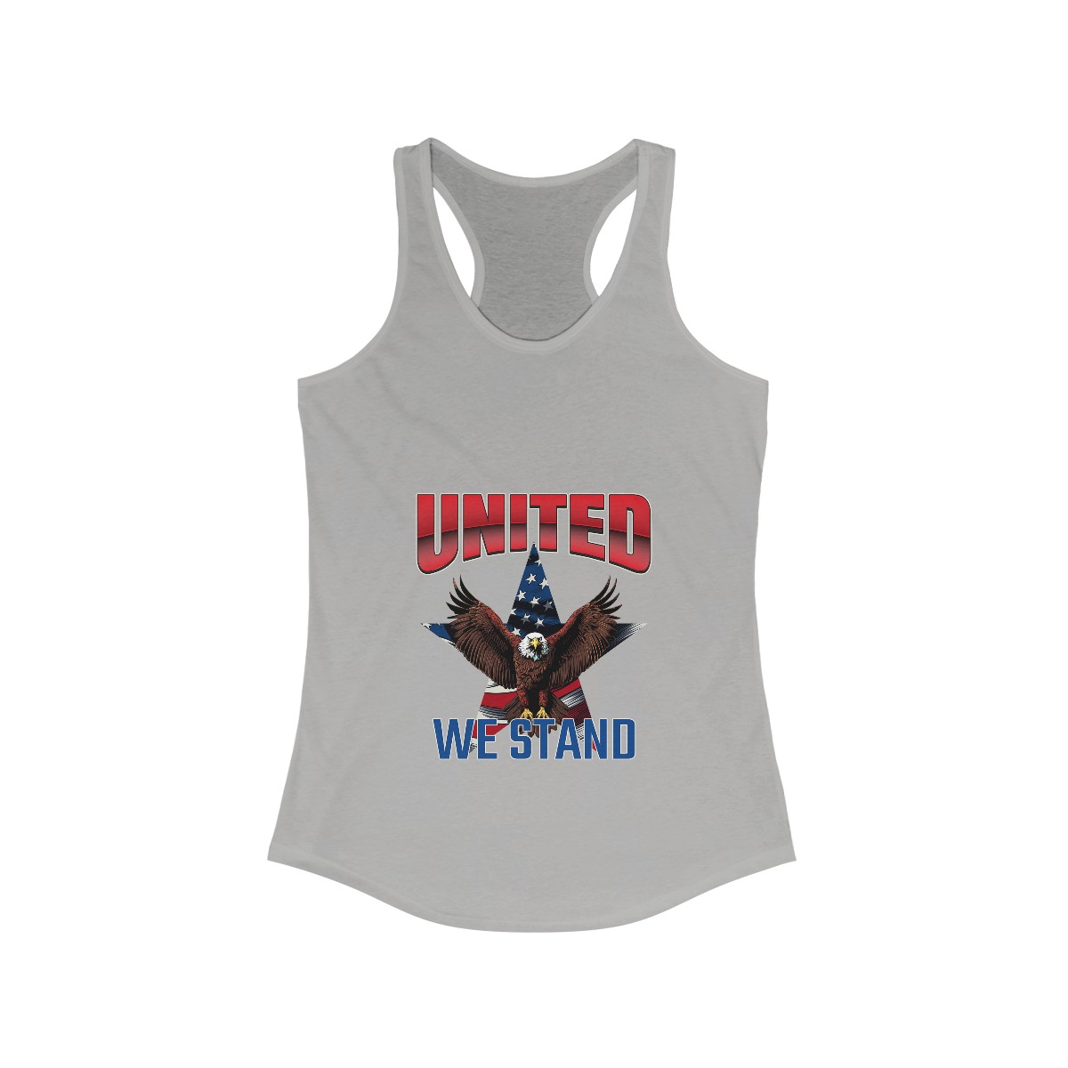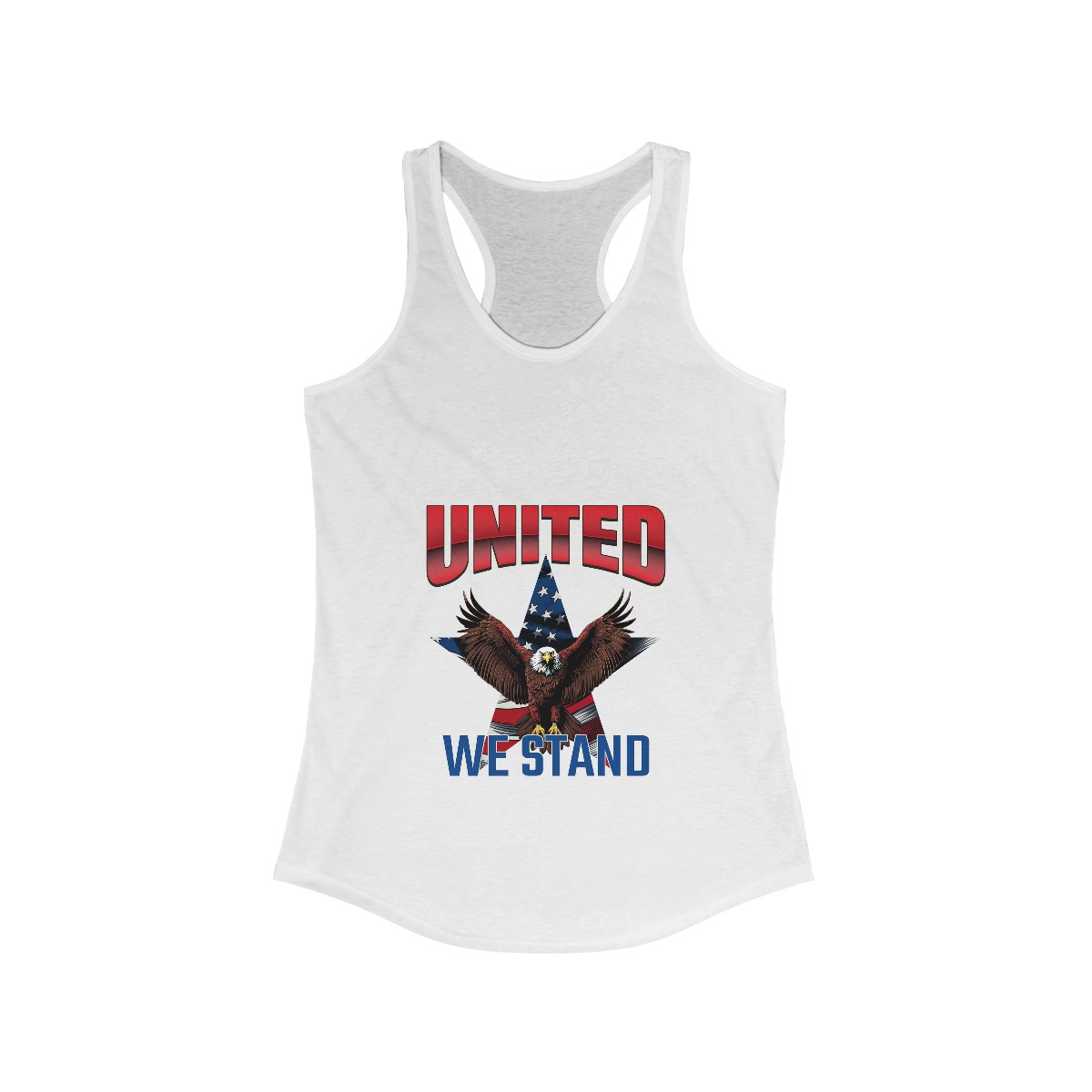 Our “UNITED WE STAND” women’s racerback tank features a bold design that symbolizes unity and freedom. This patriotic women’s tank is perfect for showcasing your American pride at any event. Additionally, it stands out in a crowd, making a strong statement about your values.