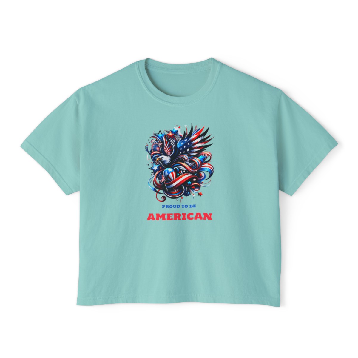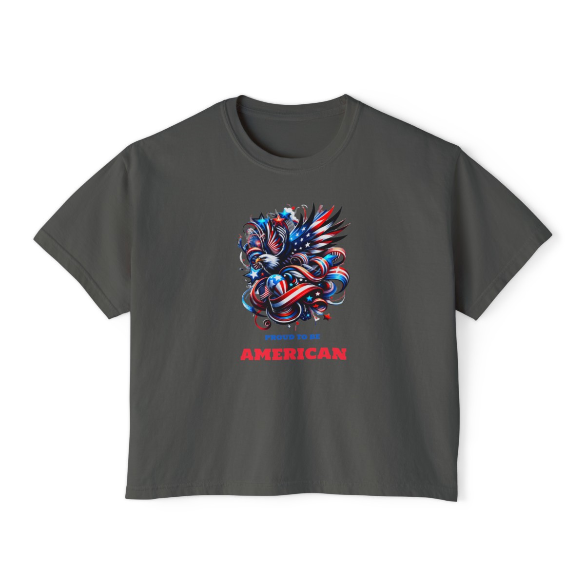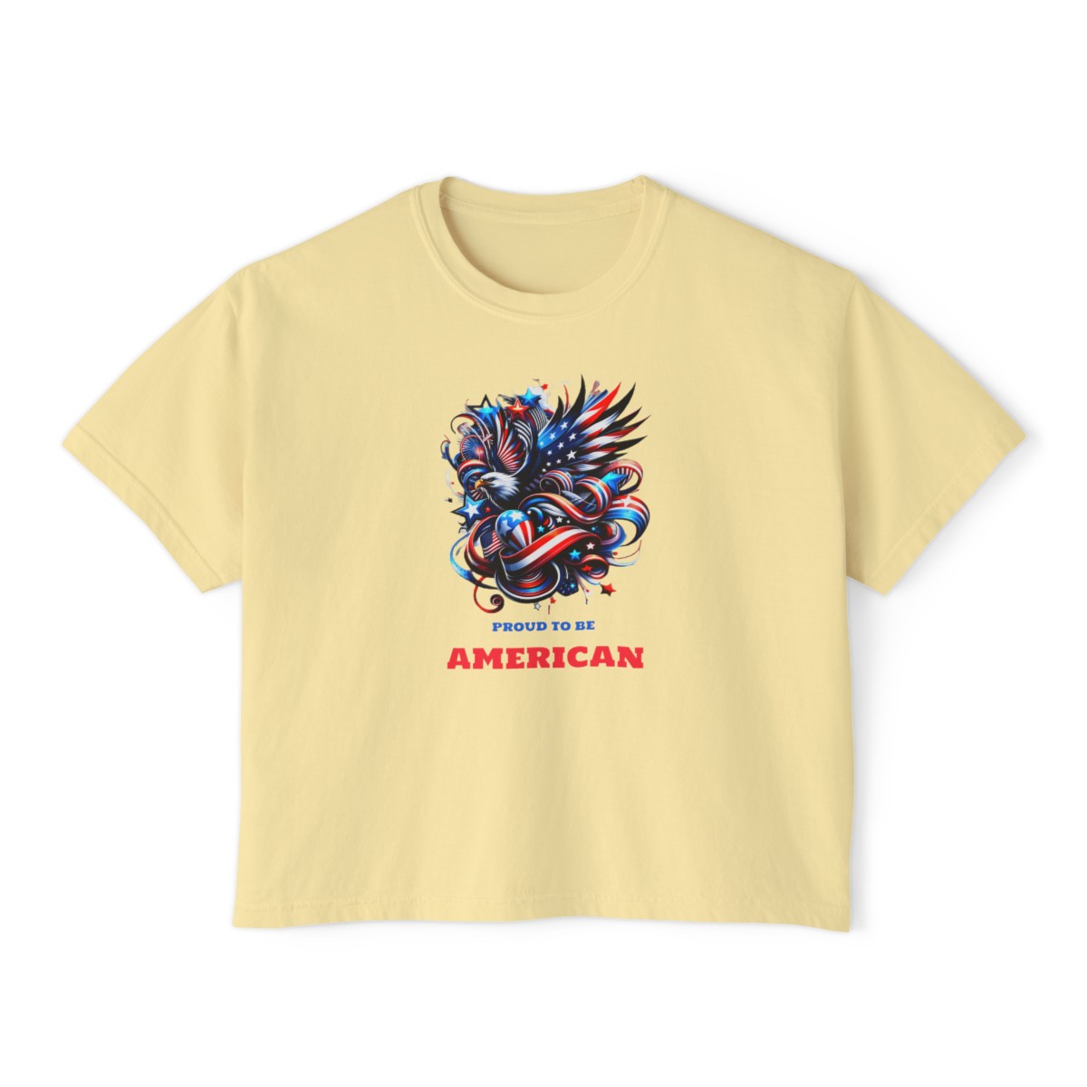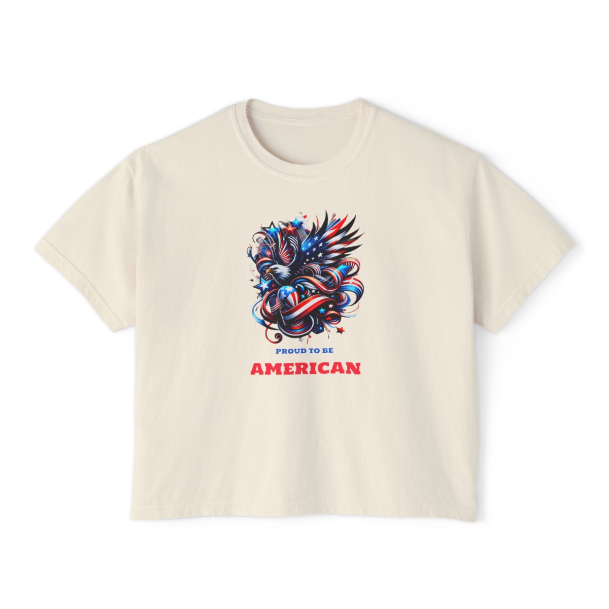- Patriotic women’s boxy tee available in various sizes and colors.