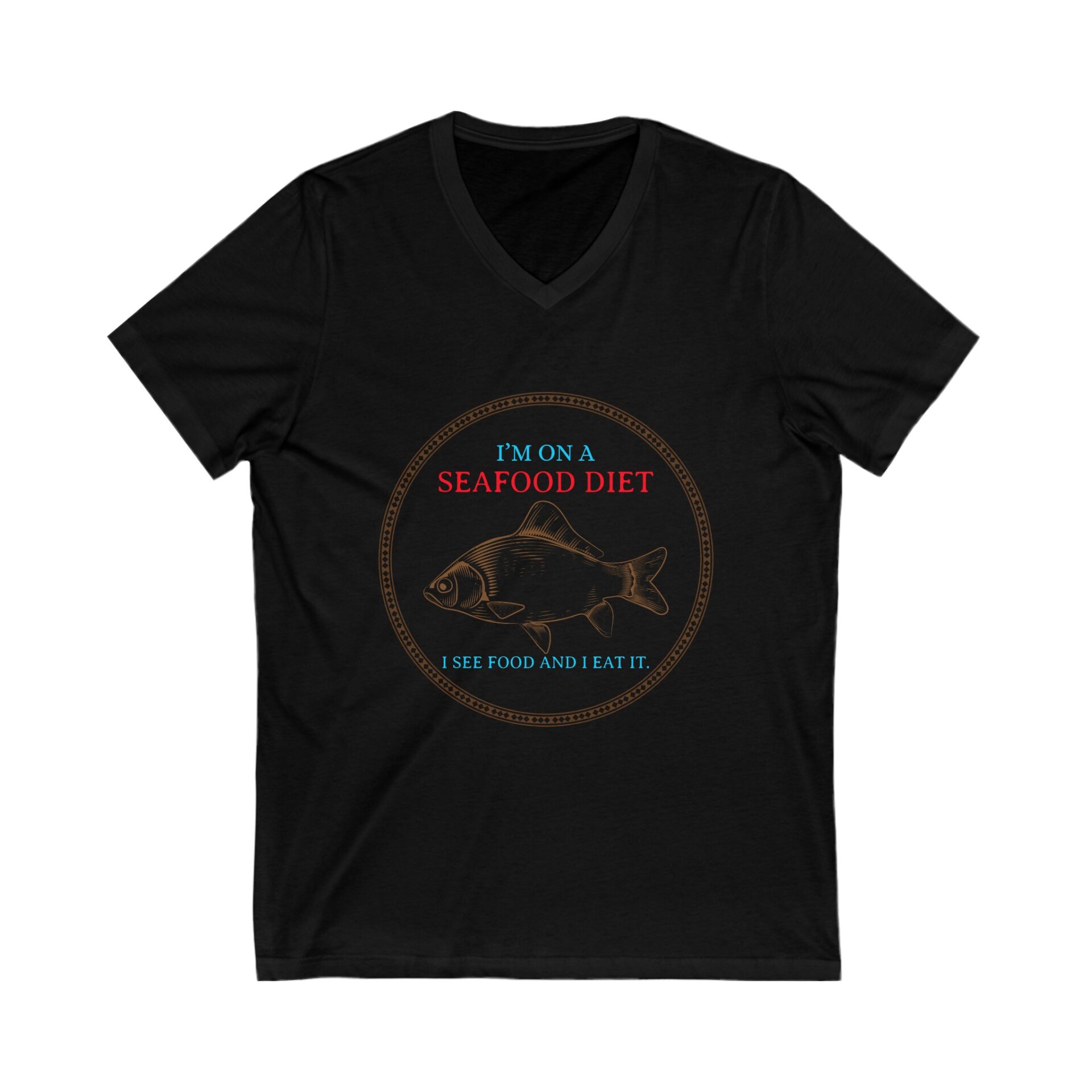 This T-shirt features the playful phrase “I’m on a Seafood Diet, When I See Food I Eat,” making it a fun addition to any wardrobe.