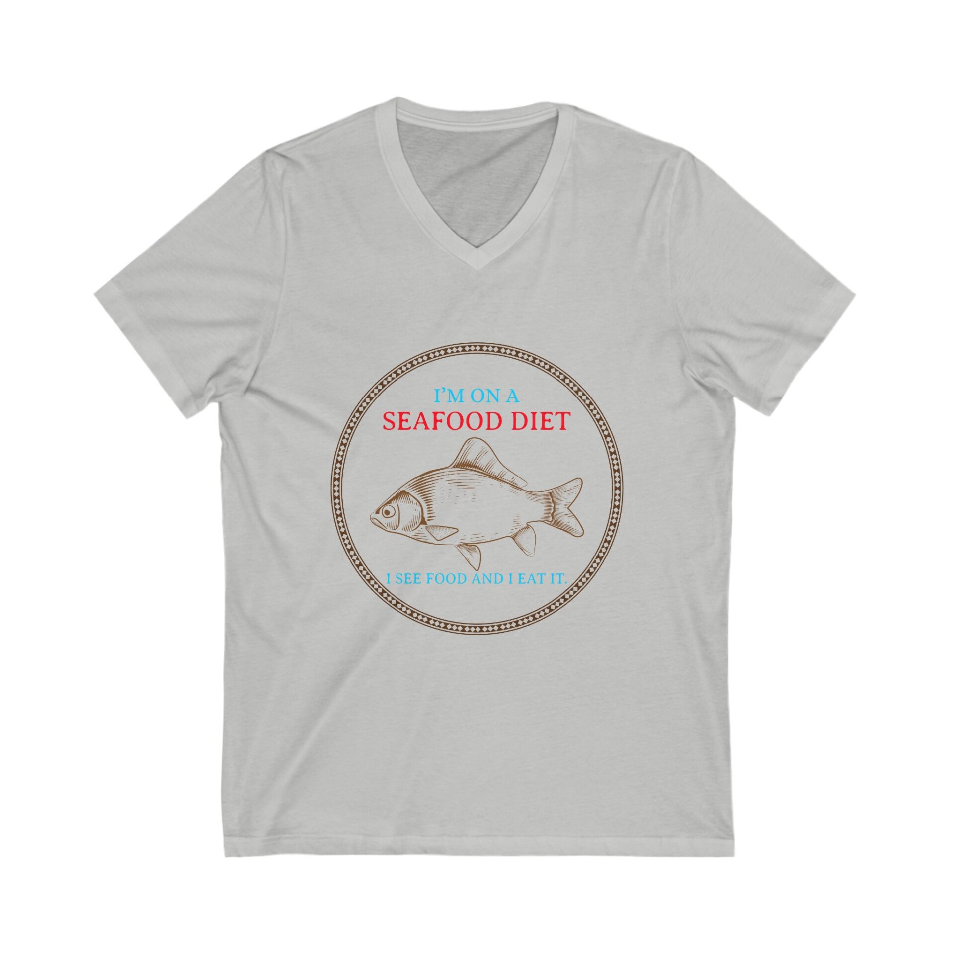 Elevate your casual wardrobe with this V-neck tee featuring the humorous “I’m on a Seafood Diet, When I See Food I Eat” design. Crafted from lightweight 100% cotton, this tee ensures a smooth and comfortable wearing experience, perfect for any season. The V-neckline and retail fit provide a stylish silhouette that works well in both casual and semi-formal settings. Manufactured in the USA by Bella+Canvas, a brand committed to ethical practices, all tees are made under Fair Labor Association rules and Platinum WRAP certified for peace of mind.